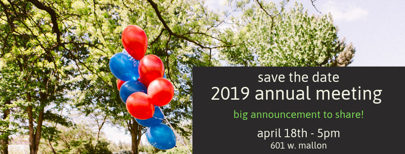 Please join us in our Main Branch lobby at 601 W. Mallon on April 18th at 5:00 p.m. for an overview of 2018 and what we’re looking forward to in 2019 – including the reveal of new changes to our brand image!